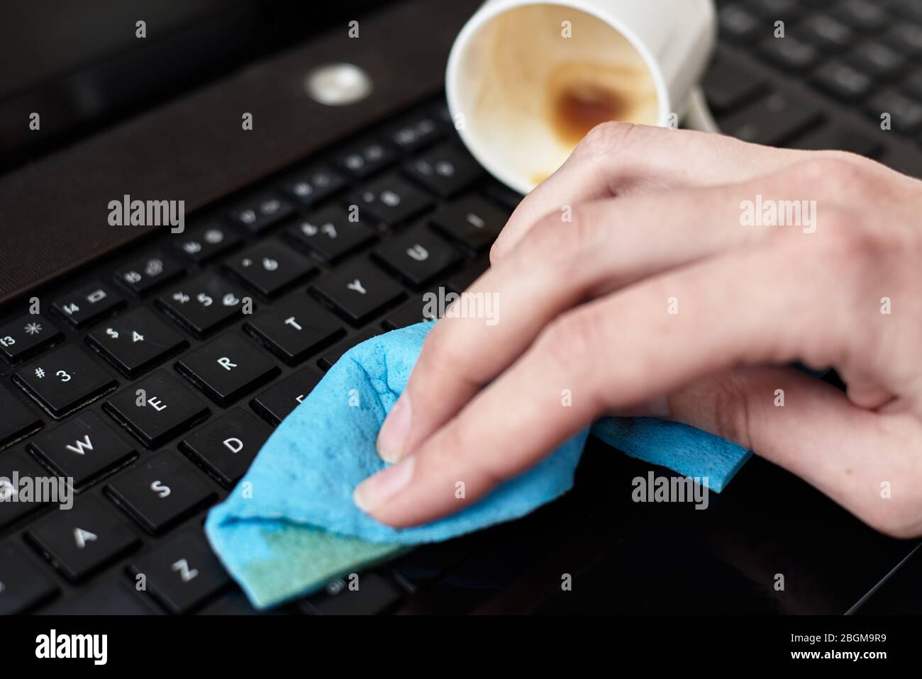 Hand Cleans Spilled Coffee On Laptop Keyboard With Rag Stock Photo Alamy