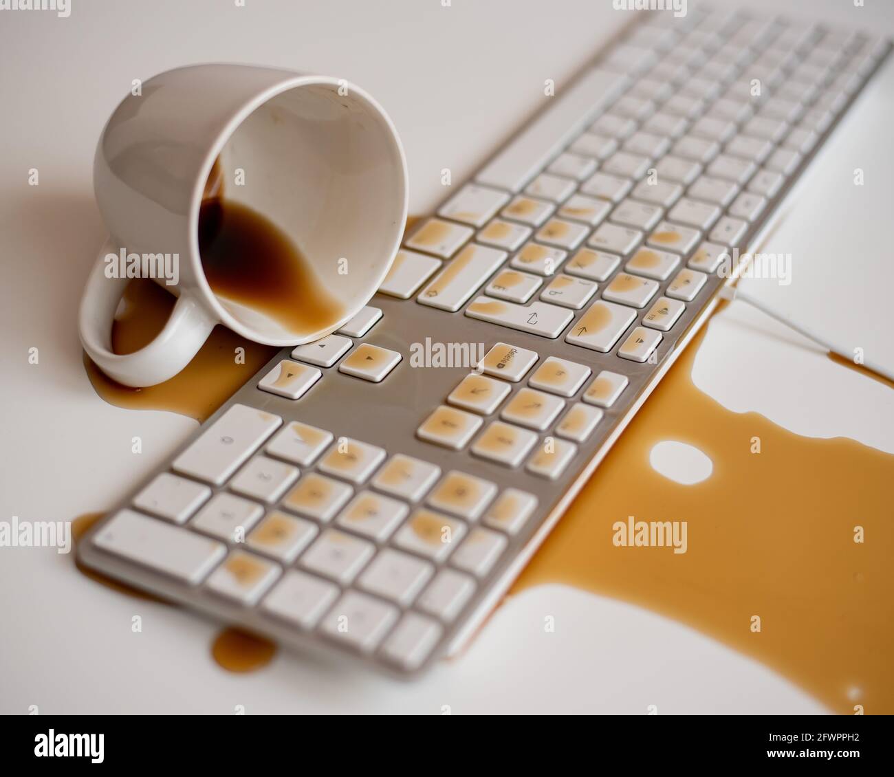 Spilled Black Coffee On A Computer Keyboard At A White Table Stock Photo Alamy